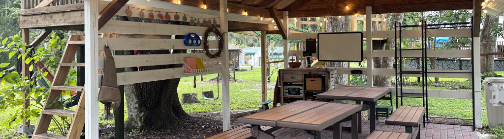 Our gathering spaces include an open-air pavilion and a spacious screened-in porch classroom, both designed to keep us connected to the outdoors while offering welcome shade from Florida’s sun and sudden showers. The pavilion is our main classroom hub for circle time, group projects, and hands-on lessons, while the screened porch offers a quiet nook for small-group work and board-game play during “your choice” time. In cooler months, we often gather around the fire as another central spot for connection and project work. Each space keeps the sights and sounds of the garden close, supporting our goal of learning with nature in every season.