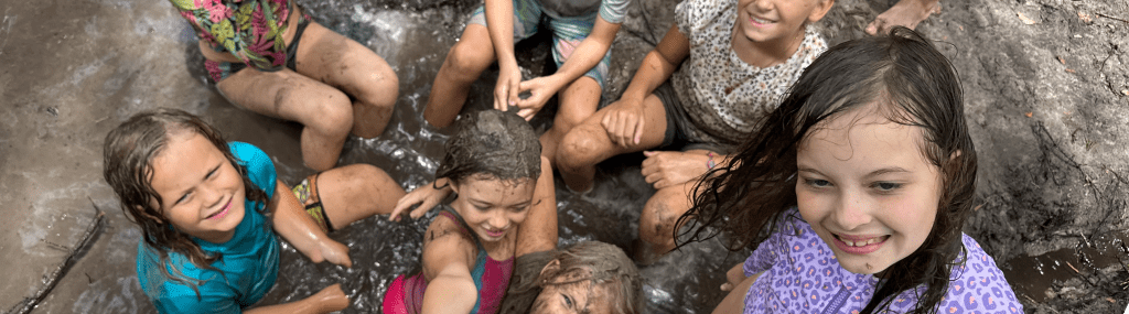 Our muddy area, complete with a mud kitchen with working water features & outdoor shower for play & rinse off, is a hands-on haven for sensory exploration and creative play. Kids dig, mix, pour, and build, learning about textures, cause and effect, and the natural world through active experimentation. Every splash and squish sparks curiosity, imagination, and joyful connection with the outdoors- and with the educators, who often join in!