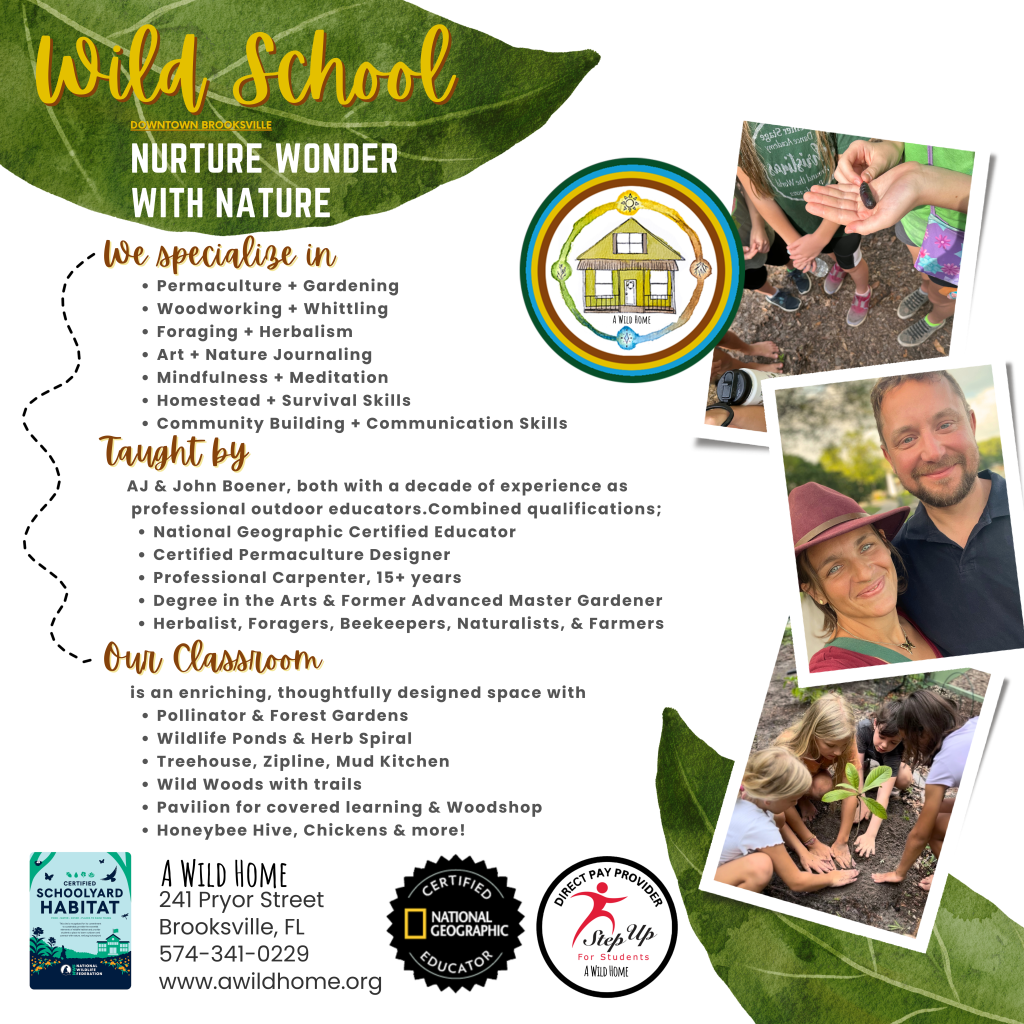 Subject Matter– At Wild School, AJ integrates her and John’s expertise and passions into a nature-connected learning experience. Guided by a seasonally centered curriculum she has carefully designed, each activity is thoughtfully tailored to reflect their knowledge, while nurturing children’s curiosity and connection with the natural world. Learners explore topics such as; Mindfulness, meditation & breathwork, foraging, wildcrafting, woodworking & carpentry, permaculture and design, herbalism, gardening, beekeeping, rhythmic nature-connection, nature journaling and art, survival and homesteading skills, storytelling, whittling, ecocentric education, composting and vermicomposting, sustainability and eco-friendly practices, native and Florida-friendly planting, pollinator plants, natural dyeing, mushroom cultivation, aquaponics, animal husbandry, safe loose parts play, and more.